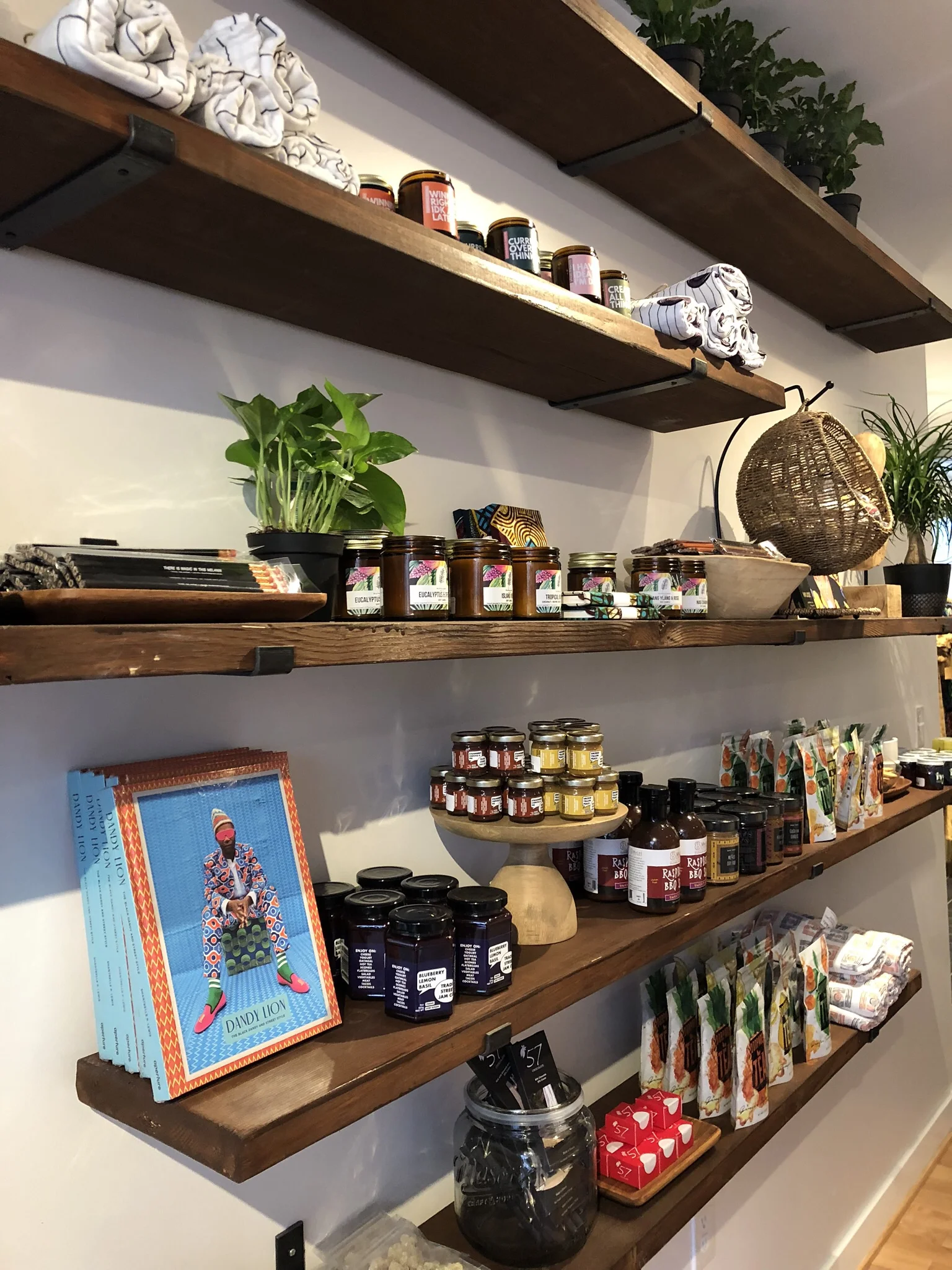 Since the space is narrow, we utilized all the wall space. The custom shelves went all the way up. The top shelves are not shoppable, but they provide much-needed storage for surplus product and bring your eyes up. It's also helpful to not have all the product display pieces be floor furniture.