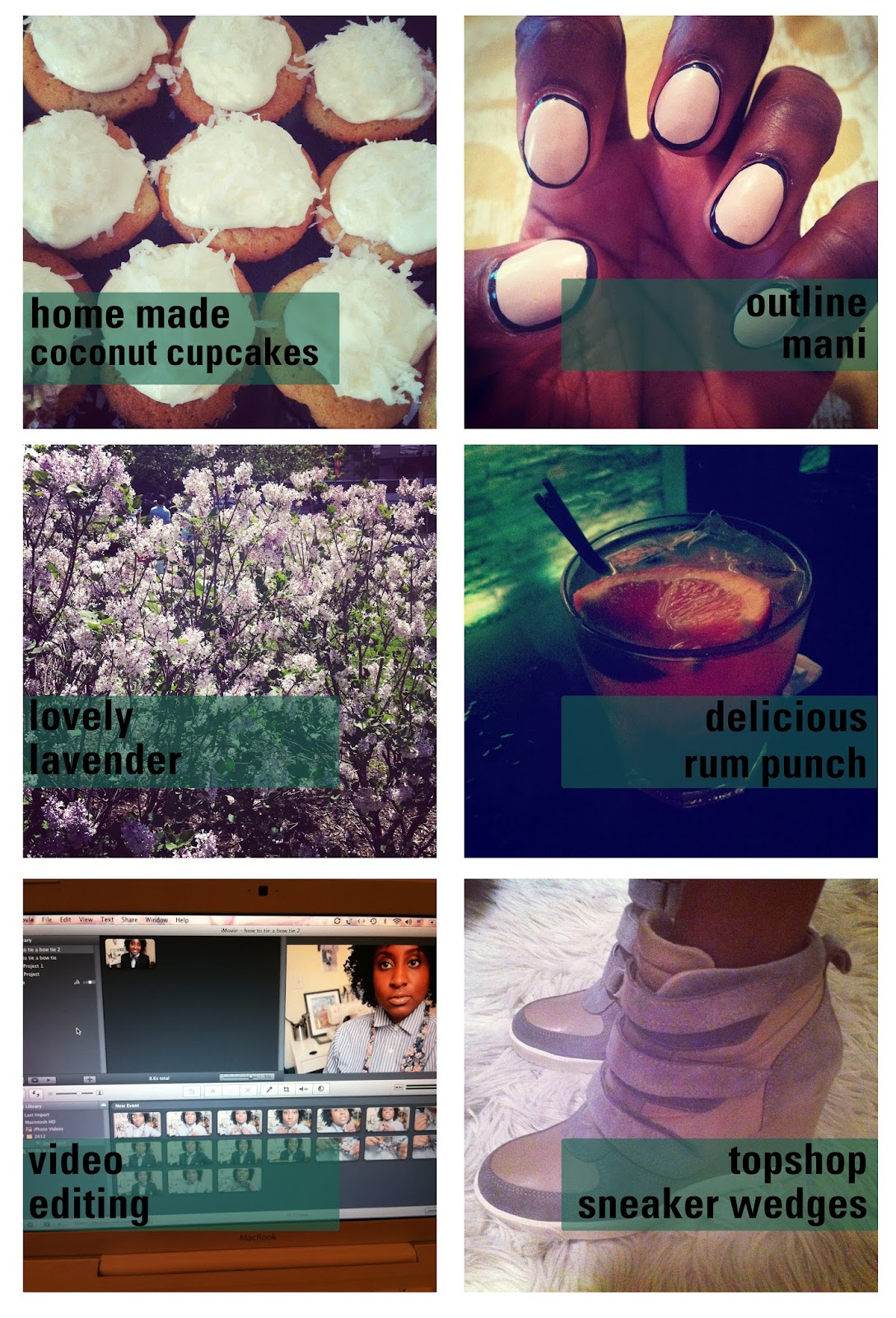 Anywho, here are a few fun photos from the past couple of weeks. Homemade cupcakes for my mom and sister on mothers day, fun outline mani that i gave myself, loving these lavender bushes in the Rose Kennedy Greeneway here in Boston, delicious rum punch I had at OM in Harvard Sq, editing my how to tie a bow tie video (check it out if you haven't seen it!), and last but not least topshop turned me into a sneaker wedge believa! Love these shoes.