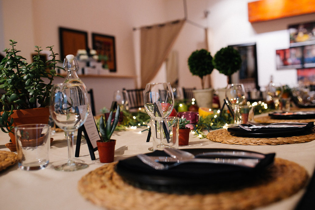 When I began concepting, I became obsessed with matte black plates for the table. I’m pretty obsessed with the matte black plate set that we ended up using from Ikea. They are super elegant and a deviation from most of the table decor that I’ve seen on the interwebs. They also felt like the right mix of formality and familiarity for this particular event. From there I brought in woven place mats also from Ikea to bring in a natural element to the table. Like layering flavor in food, it’s important to layer when it comes to table decor. I focused mostly on texture and color for this design.