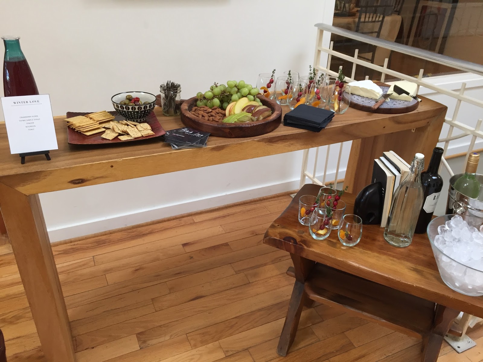 I pulled together fruit (apple, pear, grapes), nuts, almonds and cheese (brie and champagne cheddar) for the cocktail hour. Cocktail hour is a good look because it gives the host time to finish things up and gives late guests time arrive before dinner. I find that brie, some kind of cheddar, and goat or blue cheese are the best options for a larger group where you are unsure of everyones taste.